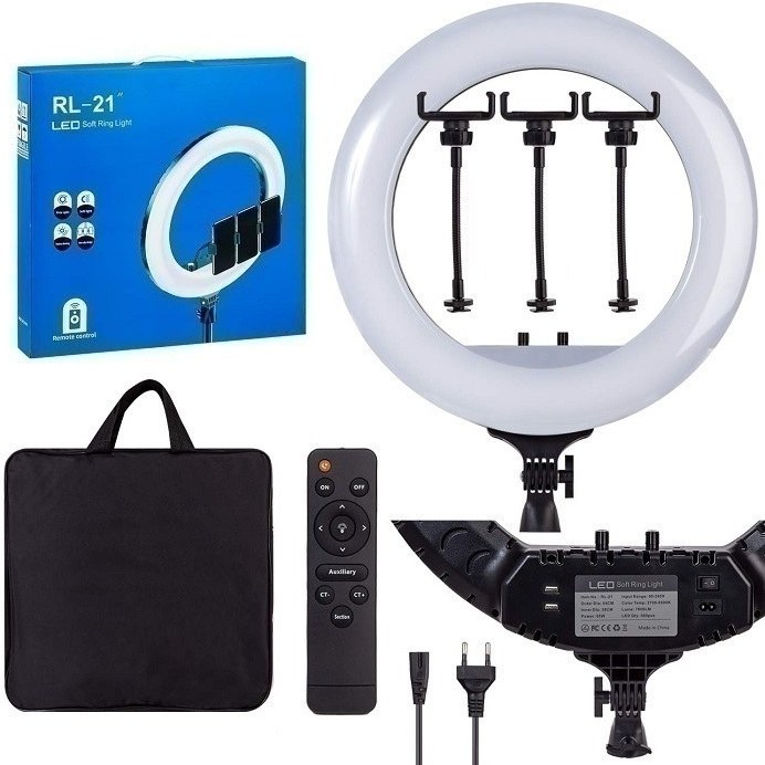 - RL-21:رینگ لایت اورجینال RL-21 با قطر ۲۱ اینچ (حدود ۵۴ سانتیمتر) یکی از حرفهایترین گزینهها برای نورپردازی در عکاسی، تولید محتوا، آرایش و آموزش آنلاین محسوب میشود. این مدل نسبت به RL-18 بزرگتر و قدرتمندتر است و امکانات بیشتری برای کاربران حرفهای فراهم میکند.